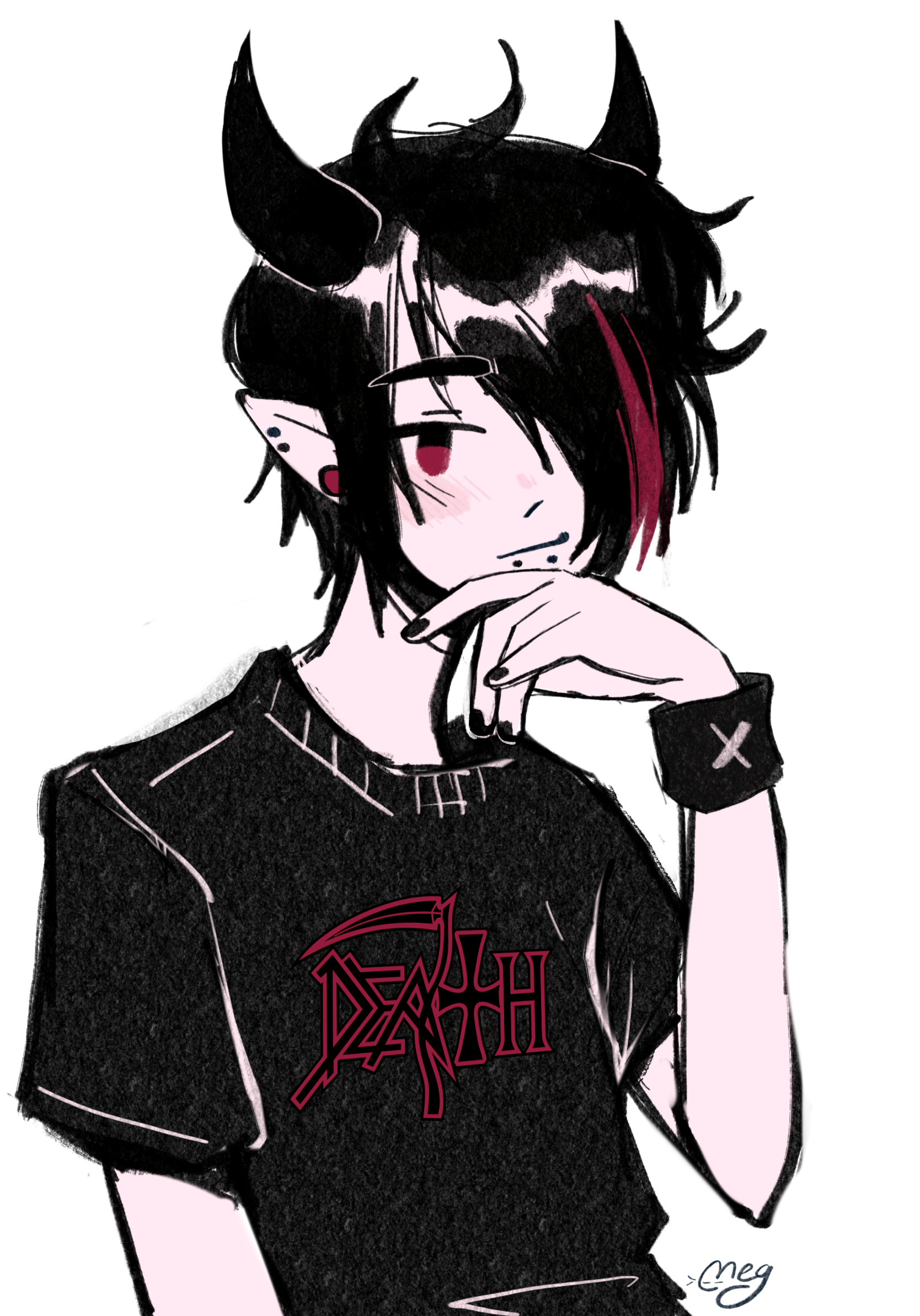 Has a red streak in his hair, large red gages in his ears, and snakebite piercings. Only wears black clothing often depicting a band or skater logo. Basically looks like he crawled out of a Hot Topic. Instrument of choice is a Warlock electric guitar.lighthearted and kind to everyone, marshall is a good friend. he works hard at his job at the local pub & plays hardcore metal/punk music in a semi-successful band.Marshall grew up in Heck with June as a close friend. He supports her streams and often joins in gaming sessions to provide comedic commentary
