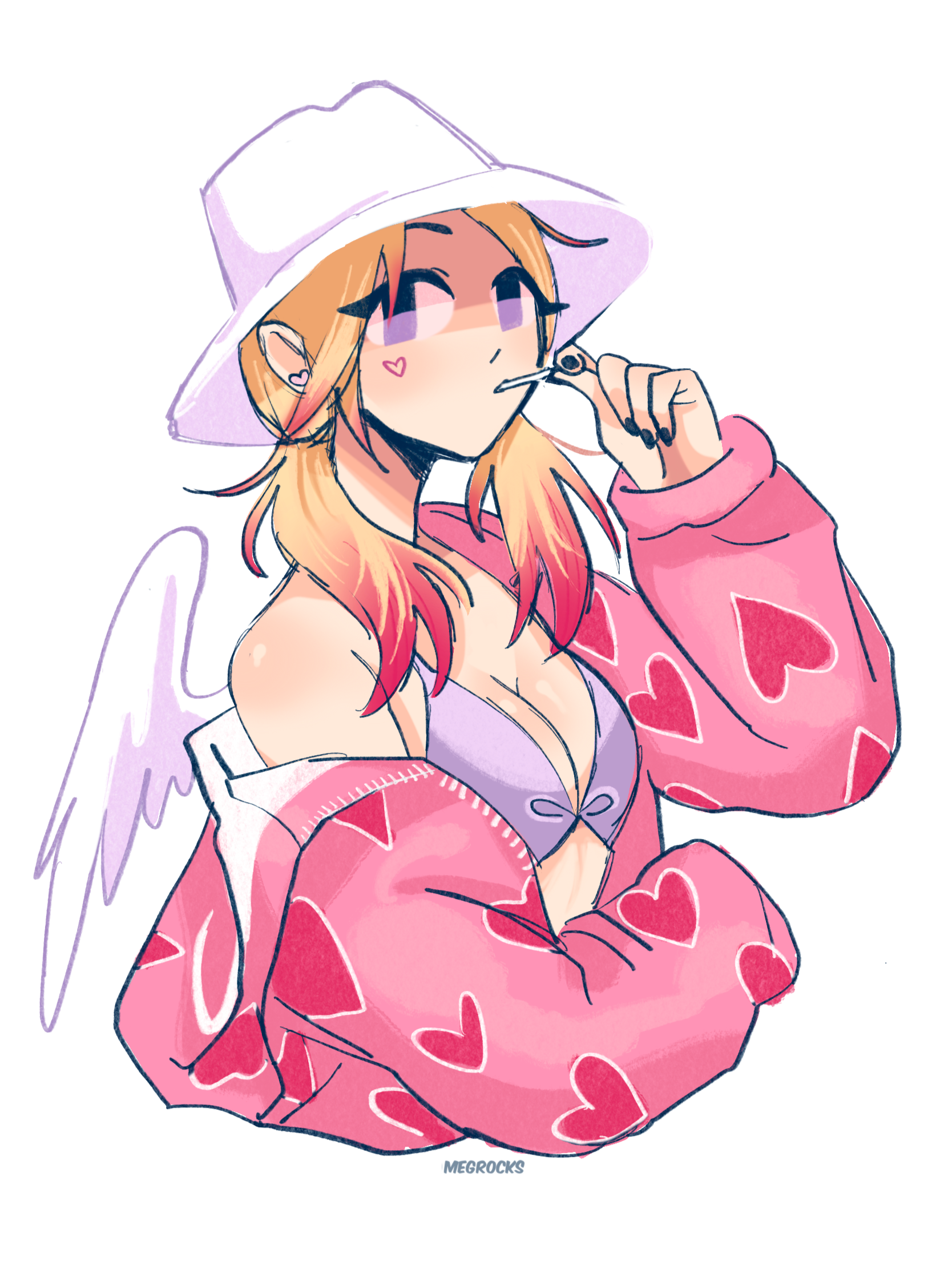 she has a small pink heart tattoo below her right eye, wears love-core clothing, and has long blonde hair that has a hot pink balayage (gradient towards the ends)claire is a sassy cupid who attends paradise university. something of a valley girl, her hobbies include; partying, shopping, obsessing over boys, ensuring her place as a queen bee and putting down other girls. she loves love, in a rather unhealthy way.