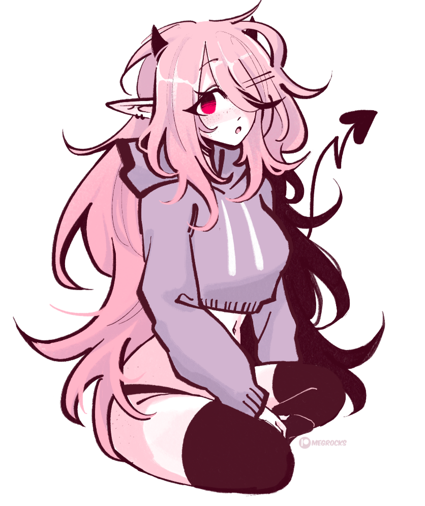 As a succubus, June has small black horns and a bent heart-shaped tail. She always has two black bobby pins in bangs that often cover her left eye, two black earrings on both ears, and has lots of freckles that cover her cheeks, shoulders, chest and arms. She dresses for comfort, often including a cropped oversized hoodie and black thigh high socks.June spends most of her time in her room at her pink gaming battlestation playing games, streaming, listening to pop-punk and watching anime. She is a creature of comfort and positivity, despite being a succubus she is incredibly wholesome and innocent. She prefers plushies and snacks over sexual acts...however she somehow ends up in lewd situations anyway. June grew up in Heck with a large family of sisters in poverty. Her escape from the chaotic household has always been video games and the internet until she managed to move to Purg and live with Kaina as roommates.