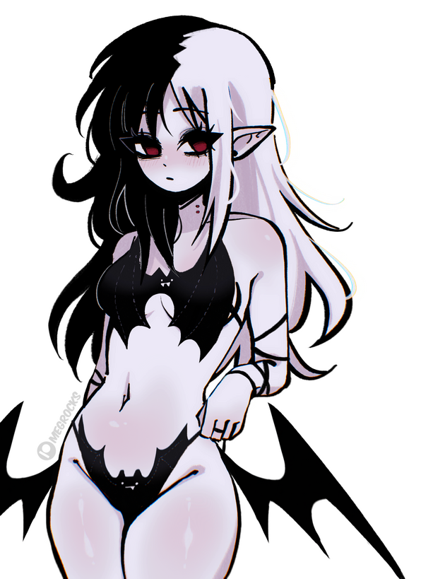 She has two moles, one on her left thigh and the other below her right knee. At least one fang is always visible and she looks sleep-deprived. She transforms into a bat for work, but enjoys having just her wings out. Instrument of choice is a dark sunburst Thunderbird bass.Wynona doesn't like to sleep during the daytime, opting to instead spend her time on creepypasta forums and the dark corners of the internet. Due to her lack of sleep she is usually pretty tired, often dozing off or showing wild mood swings.Wynona befriended Kaina during one of her many nights out at underground house shows, and shortly formed a band.