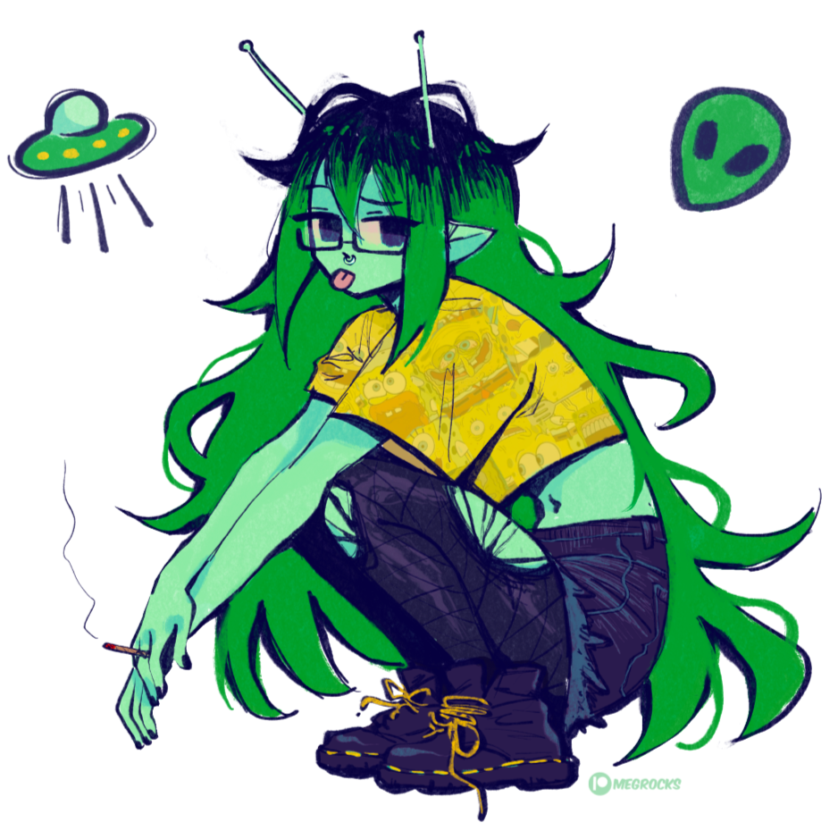 besides the green skin and dyed green hair, she has a septum piercing, wears rectangle glasses, and lets her roots grow out to terrible lengths. She enjoys wearing bright colored clothing often featuring characters from cartoons, in a punky aesthetic.Xio can be found lazing around on the couch or wherever the action is - She particularly enjoys watching cartoons, getting stoned, and partying at various festivals, events, and anything fun or exciting.Wanting to escape her strict home planet, she decided to run away and travel as a galactic tourist. She spends time in all realms, but especially enjoys raves in Heck where she meets and befriends June.She often crashes on June & Kaina's couch after parties.