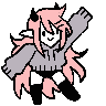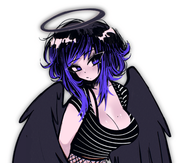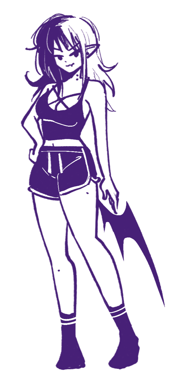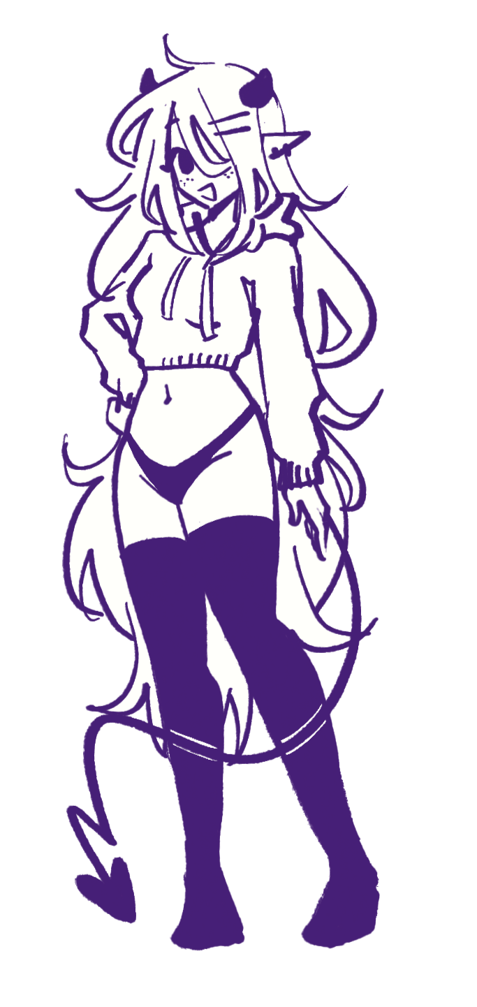As a succubus, June has small black horns and a bent heart-shaped tail. She always has two black bobby pins in bangs that often cover her left eye, two black earrings on both ears, and has lots of freckles that cover her cheeks, shoulders, chest and arms. She dresses for comfort, often including a cropped oversized hoodie and black thigh high socks.June spends most of her time in her room at her pink gaming battlestation playing games, streaming, listening to pop-punk and watching anime. She is a creature of comfort and positivity, despite being a succubus she is incredibly wholesome and innocent. She prefers plushies and snacks over sexual acts...however she somehow ends up in lewd situations anyway. June grew up in Heck with a large family of sisters in poverty. Her escape from the chaotic household has always been video games and the internet until she managed to move to Purg and live with Kaina as roommates.