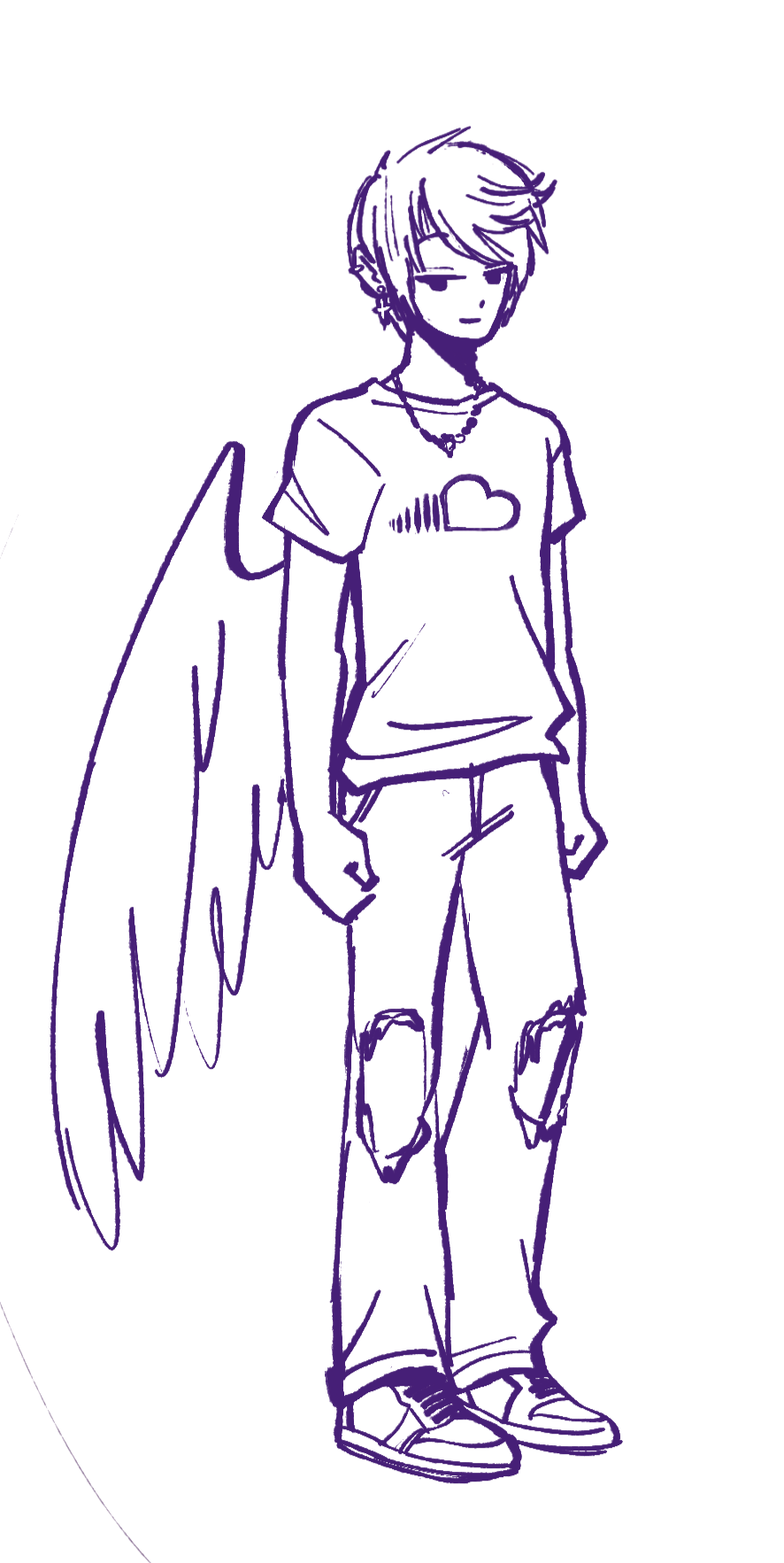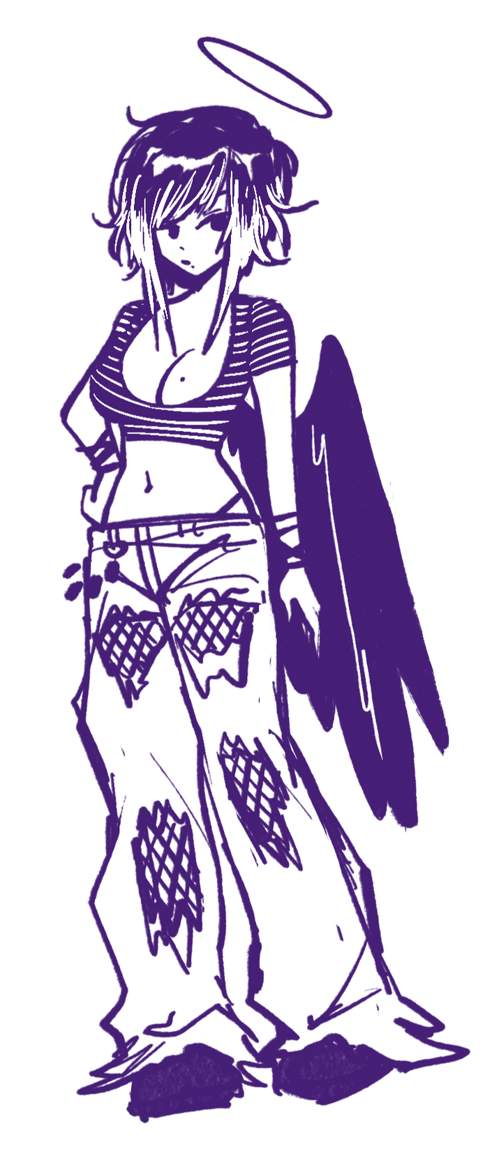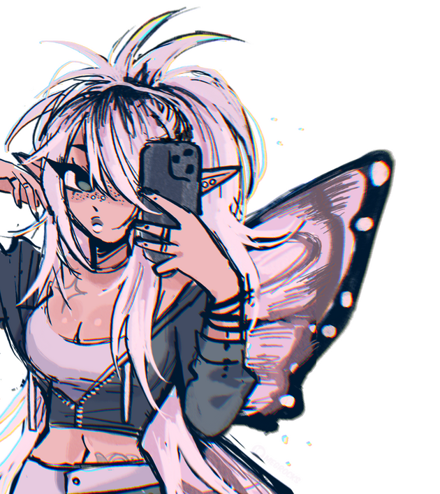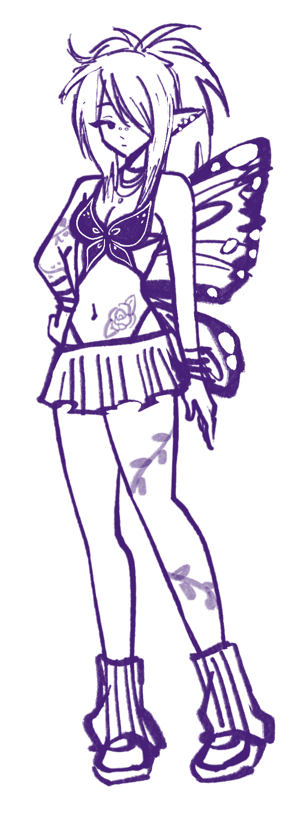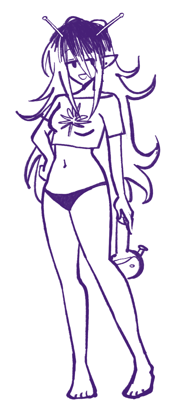 She has 4 tattoos, two wrapping vines on her left arm and right thigh; a sparkle above her left breast, and a large blue rose on her lower abdomen. She has many piercings on her ears, and a bridge piercing. Often sticks to a skimpy fairy grunge clothing aesthetic. Instrument of choice is a white Mustang guitar.A bit of a manic pixie, she is unpredictable in where she goes or what she does. Extremely laid-back, stylish and seemingly good at everything. Often plays solo gigs. She befriended Kaina after playing a set at an underground house show.