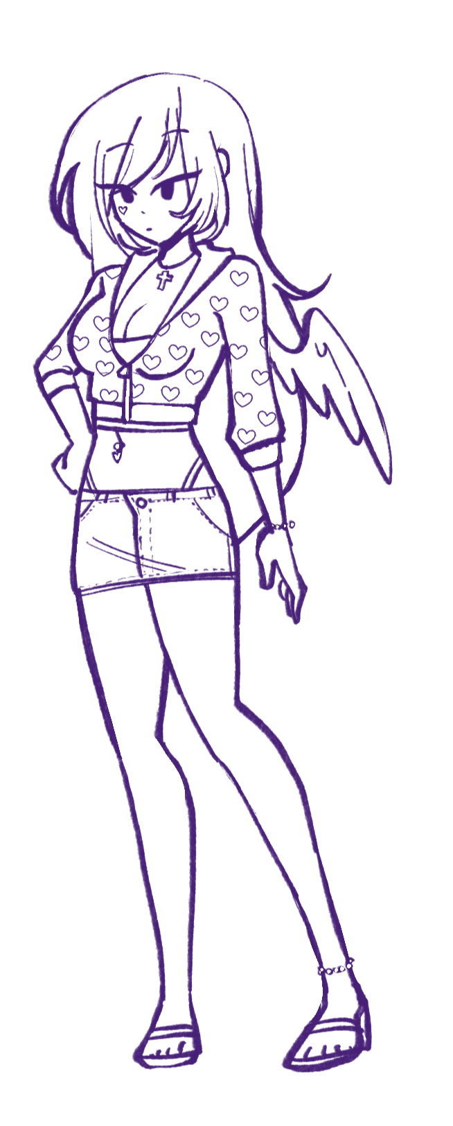 she has a small pink heart tattoo below her right eye, wears love-core clothing, and has long blonde hair that has a hot pink balayage (gradient towards the ends)claire is a sassy cupid who attends paradise university. something of a valley girl, her hobbies include; partying, shopping, obsessing over boys, ensuring her place as a queen bee and putting down other girls. she loves love, in a rather unhealthy way.