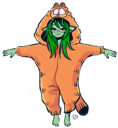 besides the green skin and dyed green hair, she has a septum piercing, wears rectangle glasses, and lets her roots grow out to terrible lengths. She enjoys wearing bright colored clothing often featuring characters from cartoons, in a punky aesthetic.Xio can be found lazing around on the couch or wherever the action is - She particularly enjoys watching cartoons, getting stoned, and partying at various festivals, events, and anything fun or exciting.Wanting to escape her strict home planet, she decided to run away and travel as a galactic tourist. She spends time in all realms, but especially enjoys raves in Heck where she meets and befriends June.She often crashes on June & Kaina's couch after parties.